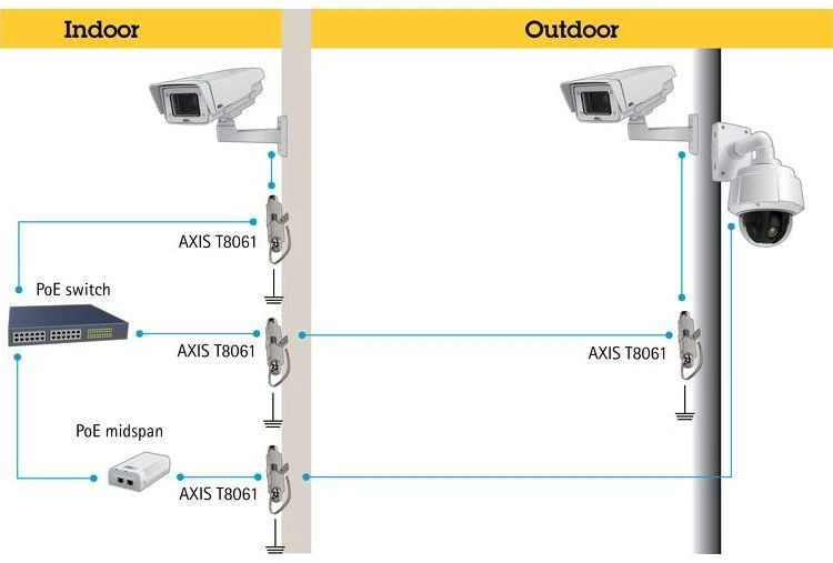 The Axis T8061 is an Ethernet surge protector that prevents network devices, such as IP cameras, switches & midspans, from being damaged by electrical surges such as lightning strikes.