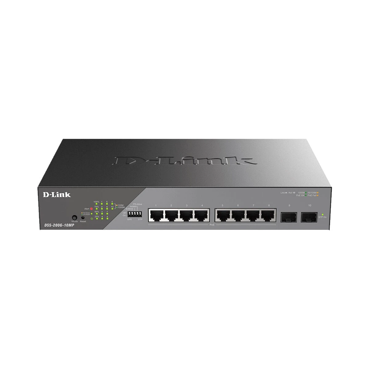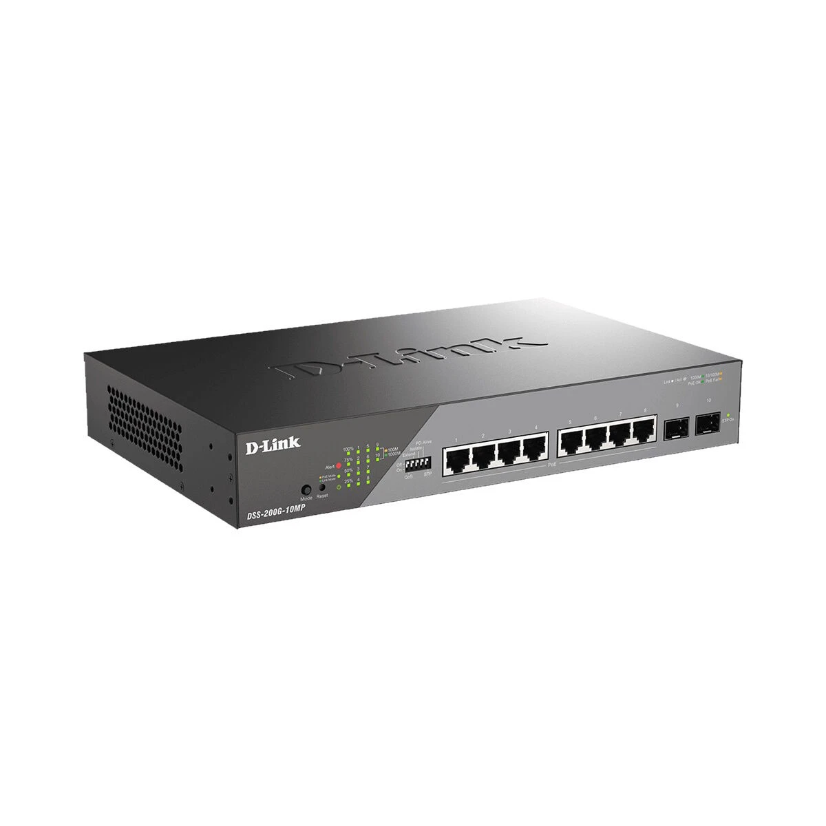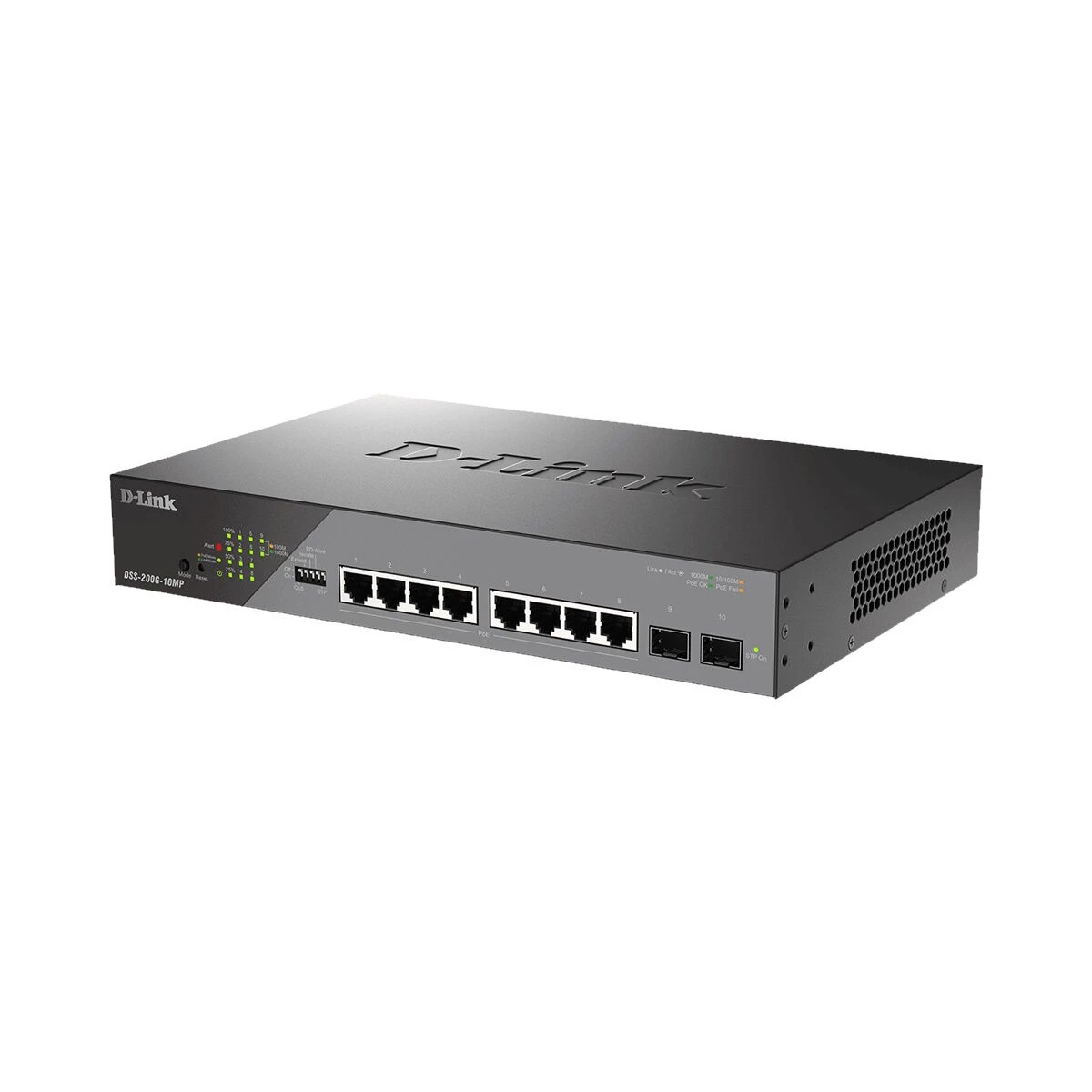 The D-Link DSS-200G-10MP contains 8 x 10/100/1000 Mbps PoE and 2 x SFP 1000 Mbps ports. It has a high PoE budget, allowing for 30W for each PoE port, and is 802.3at/af compliant. It also allows for a 6 kV surge protection of all PoE ports and is easy to deploy with its automatic configuration.