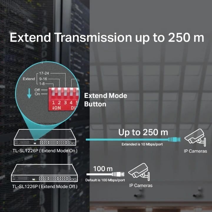 As well as this, when the unit is using the innovative Extend Mode, devices are able to get PoE power supply and data transmission from a distance of up to 250m. Not only this but Priority Mode ensure high priority for ports 1-8 which guarantees the quality of sensitive applications. The TL-SL1226P also supports Isolation Mode that divides traffic for 10/100Mbps RJ45 ports for higher security and performance.